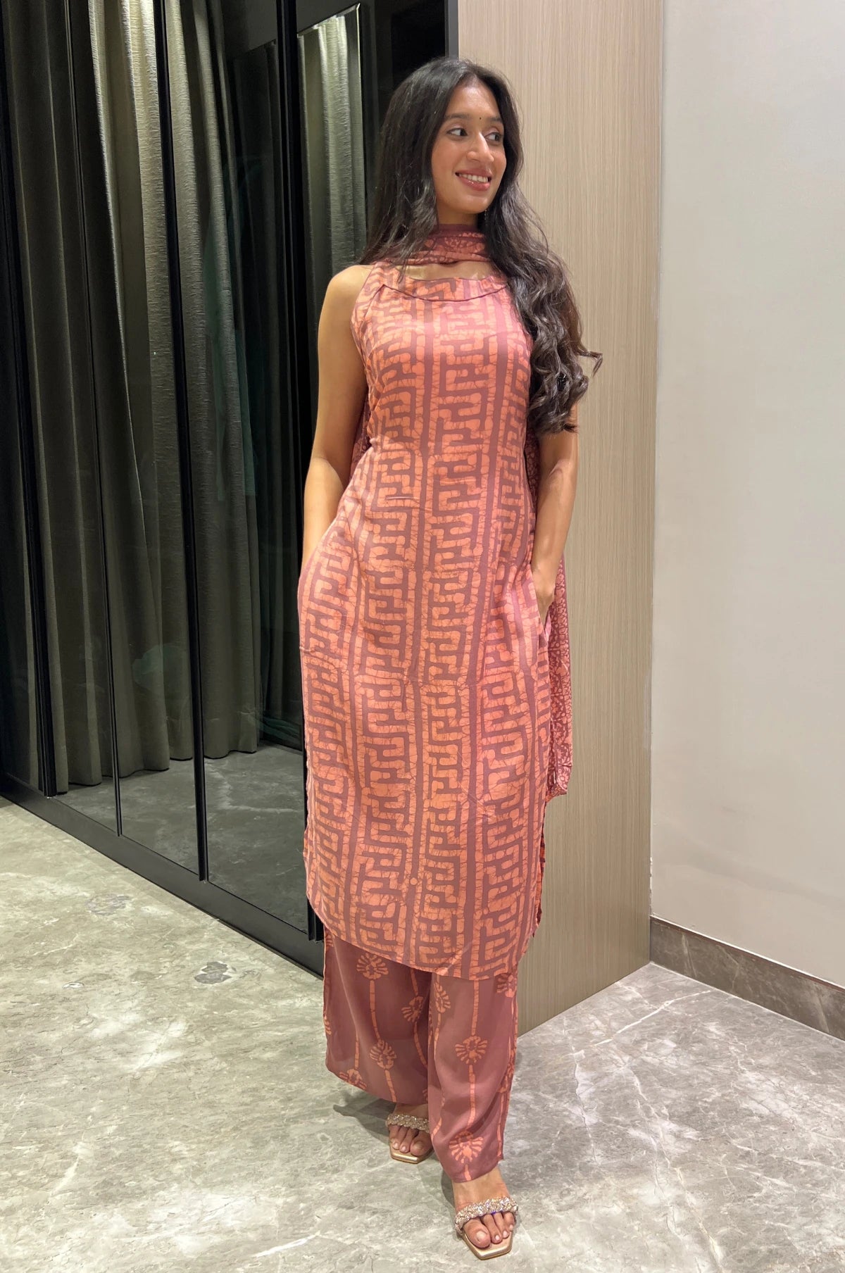 Noodle-strap kurti designed with a striking batik print, paired with palazzos featuring an all-around elastic waistband and large, functional pockets for everyday essentials.