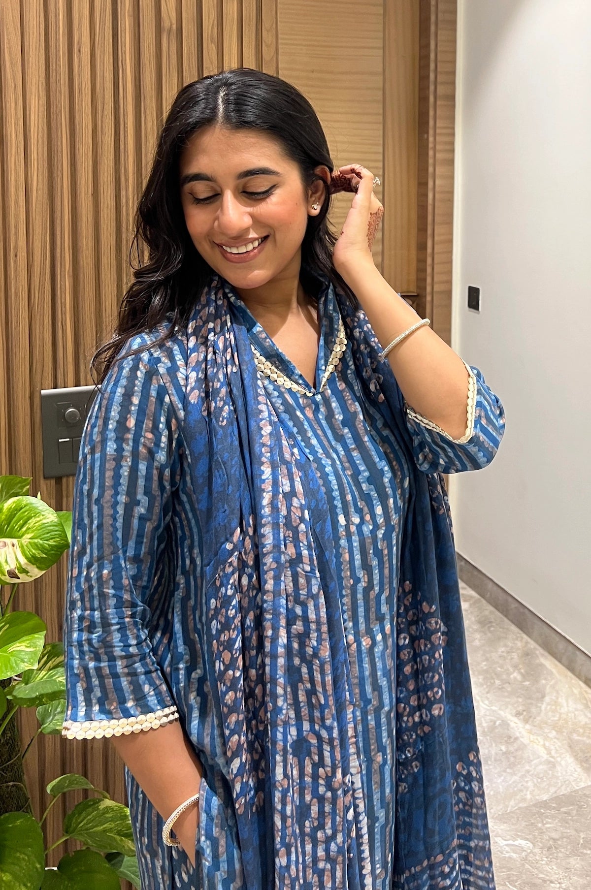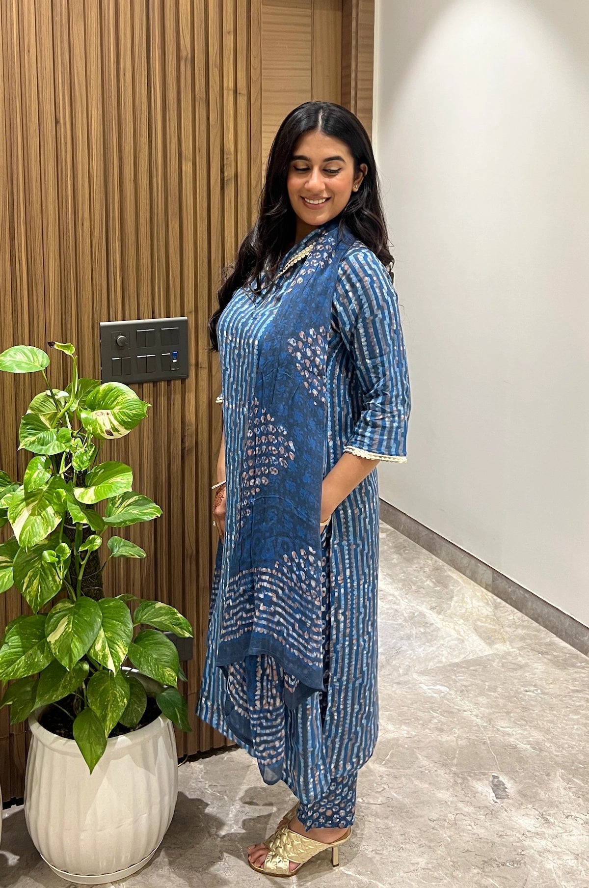 Batik hand-printed kurti in multicoloured hues of turquoise and beige, designed with a V-neck collar and 3/4th sleeves finished with delicate lace detailing along the collar and sleeve hems. Paired with coordinated pants featuring a full elastic waistband and functional pockets, and completed with a soft modal dupatta.